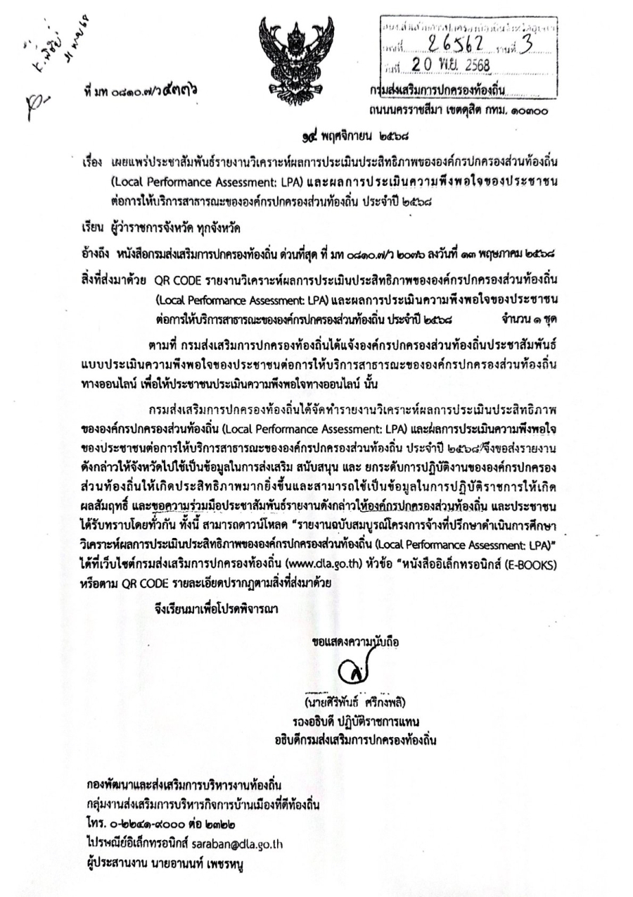 เผยแพร่ประชาสัมพันธ์รายงานวิเคราะห์ผลการประเมินประสิทธิภาพของ อปท. (LPA) ประจำปี 2568