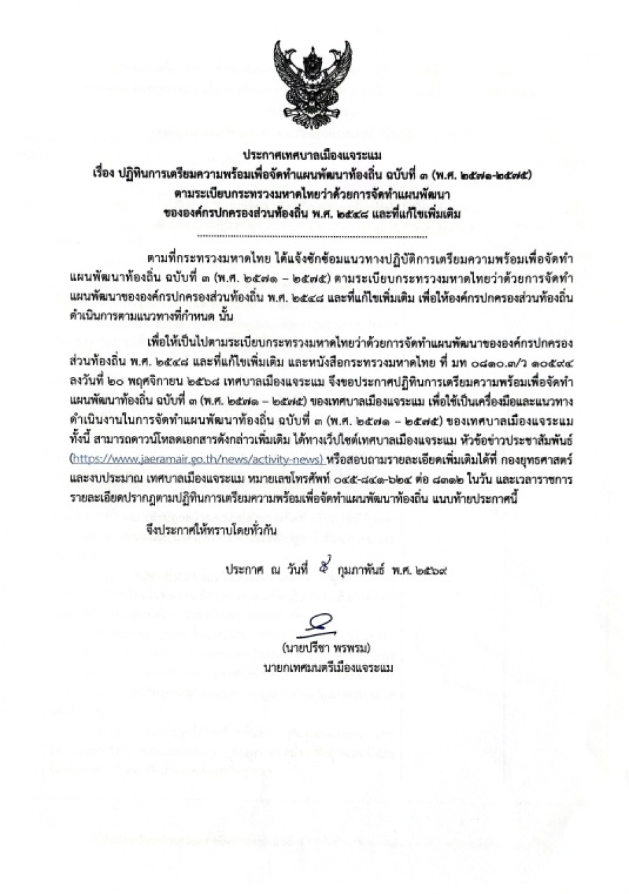 ประสัมพันธ์ปฏิทินการเตรียมความพร้อมเพื่อจัดทำแผนพัฒนาท้องถิ่น ฉบับที่ 3 (พ.ศ.2571-2575) เทศบาลเมืองแจระแม
