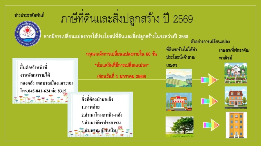 งานพัฒนารายได้ กองคลัง เทศบาลเมืองแจระแม ประชาสัมพันธ์ การชำระภาษีที่ดินและสิ่งปลูกสร้าง ประจำปีงบประมาณ พ.ศ. 2569