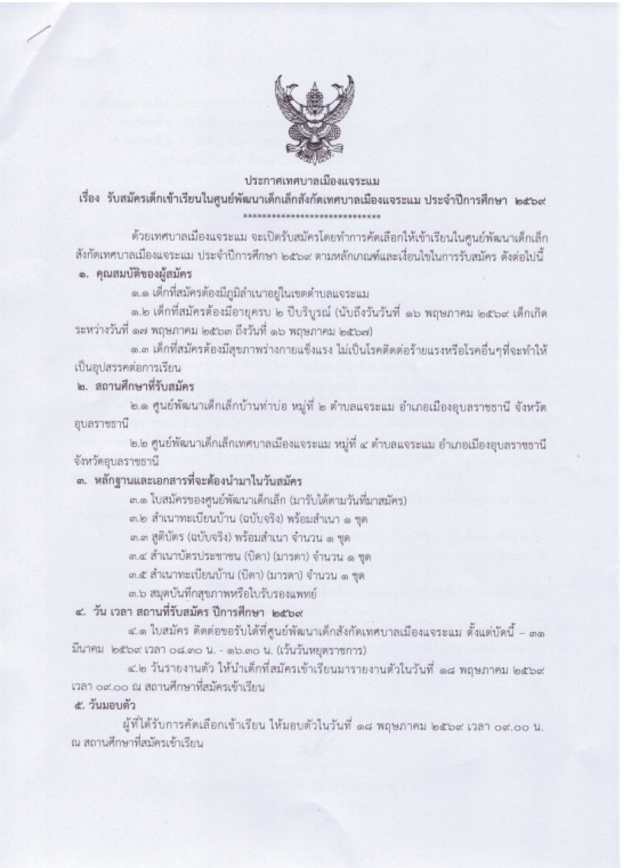 เผยแพร่ประชาสัมพันธ์การรับสมัครเด็กเข้าเรียนในศูนย์พัฒนาเด็กเล็กสังกัดเทศบาลเมืองแจระแม ประจำปีการศึกษา 2569