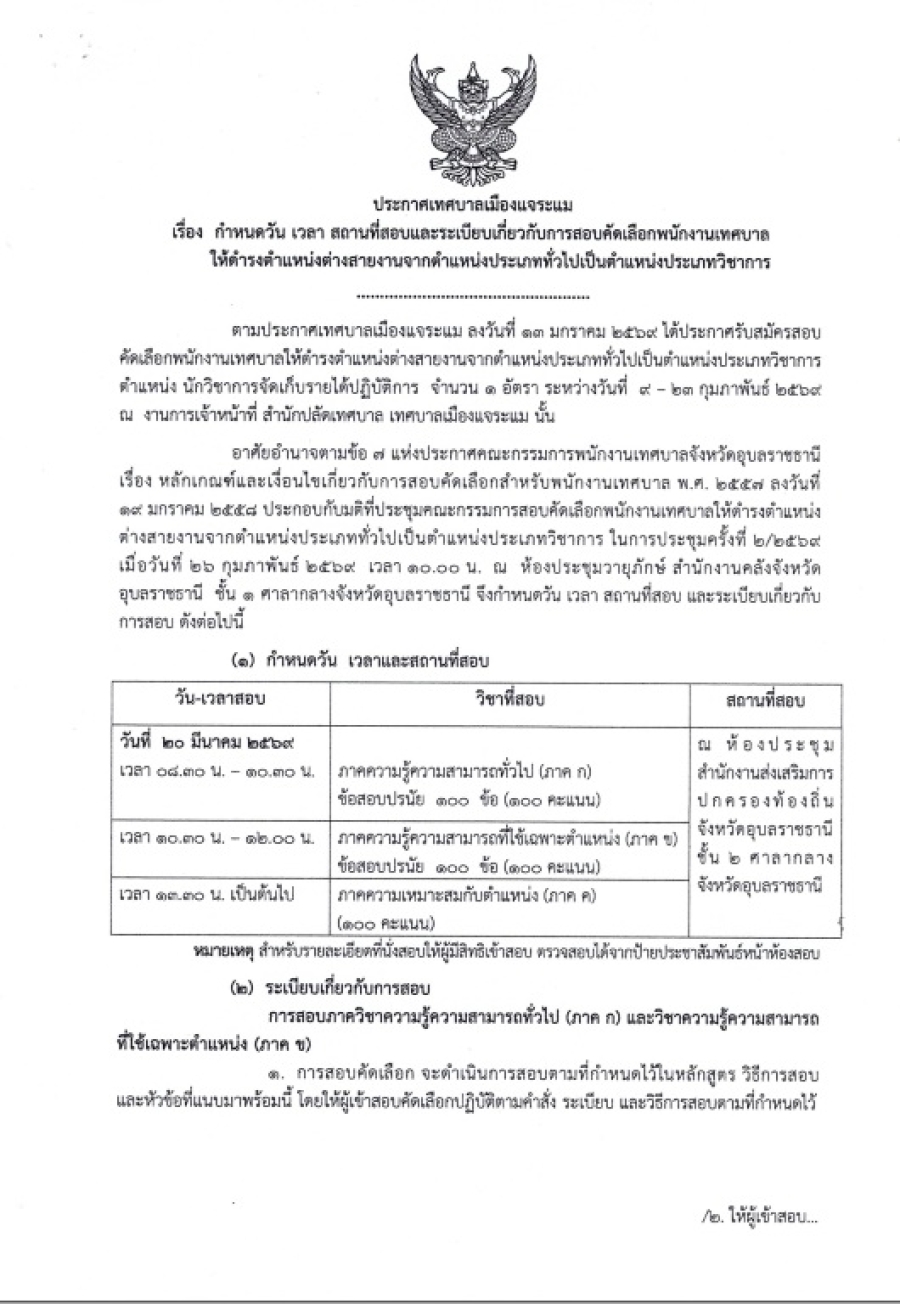 ประชาสัมพันธ์ ประกาศเทศบาลเมืองแจระแม เรื่องกำหนดวัน เวลา สถานที่สอบและระเบียบเกี่ยวกับการสอบคัดเลือกพนักงานเทศบาลให้ดำรงตำแหน่งต่างสายงานจากตำแหน่งประเภททั่วไปเป็นตำแหน่งประเภทวิชาการ