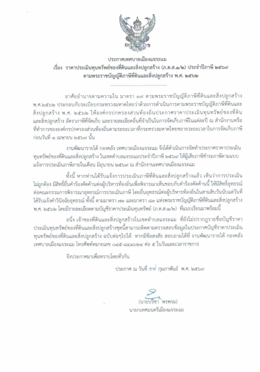 ประชาสัมพันธ์ ประกาศเทศบาลเมืองแจระแม เรื่องราคาประเมินทุนทรัพย์ของภาษีที่ดินและสิ่งปลูกสร้าง (ภ.ด.ส.1/2) ประจำปีภาษี 2569