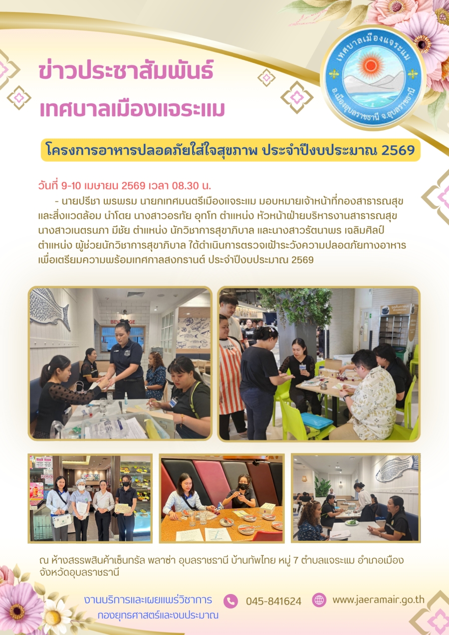 วันศุกร์, 10 เมษายน 2569 22:18วันที่ 9-10 เมษายน 2569 เวลา 08.30 น. - นายปรีชา พรพรม นายกเทศมนตรีเมืองแจระแม มอบหมายเจ้าหน้าที่กองสาธารณสุขและสิ่งแวดล้อม นำโดย นางสาวอรทัย อุทโท ตำแหน่ง หัวหน้าฝ่ายบริหารงานสาธารณสุข นางสาวเนตรนภา มีชัย ตำแหน่ง นักวิชาการสุขาภิบาล และนางสาวรัตนาพร เฉลิมศิลป์ ตำแหน่ง ผู้ช่วยนักวิชาการสุขาภิบาล ได้ดำเนินการตรวจเฝ้าระวังความปลอดภัยทางอาหาร เพื่อเตรียมความพร้อมเทศกาลสงกรานต์ ประจำปีงบประมาณ 2569 ณ ห้างสรรพสินค้าเซ็นทรัล พลาซ่า อุบลราชธานี บ้านทัพไทย หมู่ 7 ตำบลแจระแม อำเภอเมือง จังหวัดอุบลราชธานี สอบถามข้อมูลเพิ่มเติมได้ที่ : กองสาธารณสุขและสิ่งแวดล้อม ☎️โทร : 045-841624 ต่อ 8318