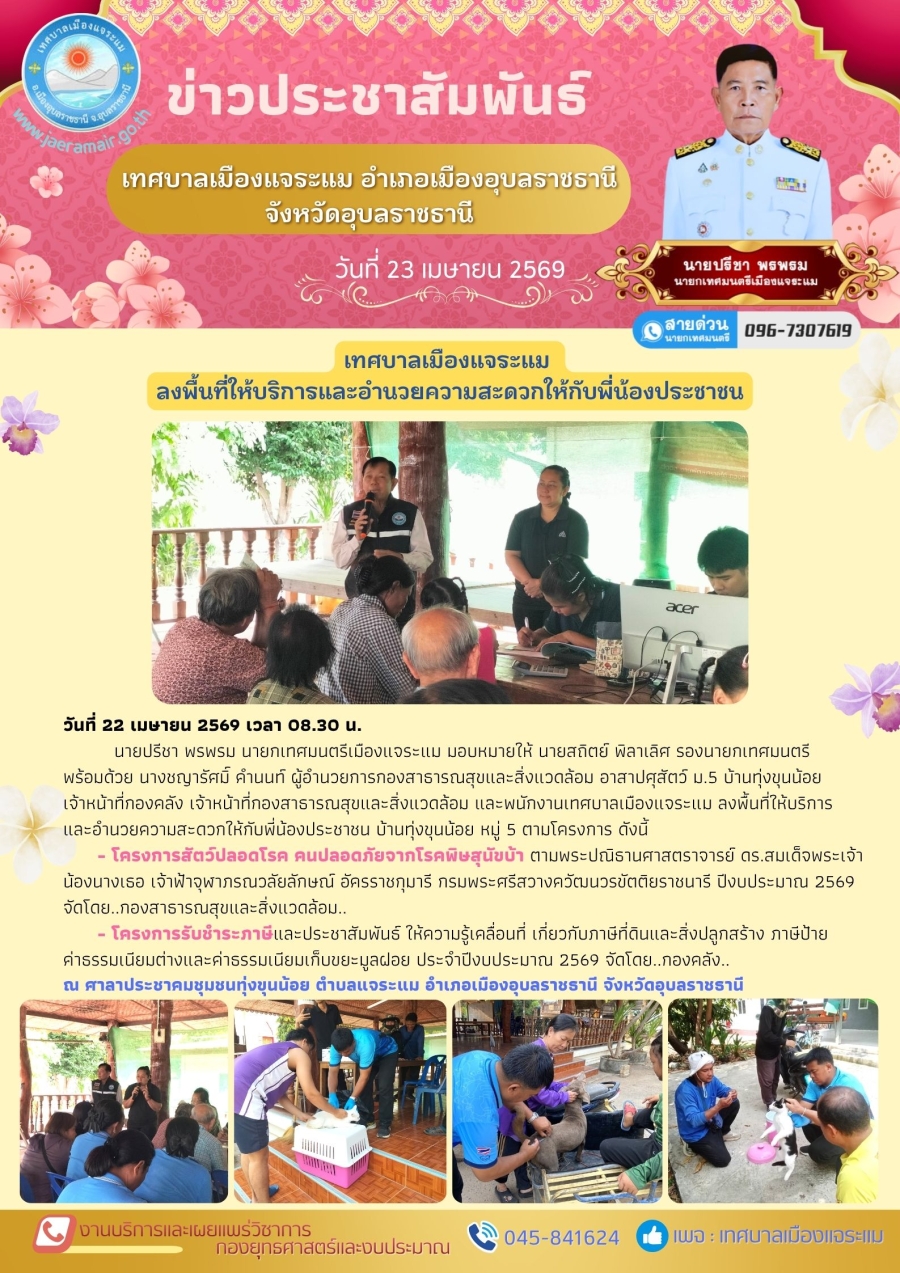 วันพฤหัสบดี, 23 เมษายน 2569 10:30วันที่ 22 เมษายน 2569 เวลา 08.30 น. - นายปรีชา พรพรม นายกเทศมนตรีเมืองแจระแม มอบหมายให้ นายสถิตย์ พิลาเลิศ รองนายกเทศมนตรี พร้อมด้วย นางชญารัศมิ์ คำนนท์ ผู้อำนวยการกองสาธารณสุขและสิ่งแวดล้อม อาสาปศุสัตว์ ม.5 บ้านทุ่งขุนน้อย เจ้าหน้าที่กองคลัง เจ้าหน้าที่กองสาธารณสุขและสิ่งแวดล้อม และพนักงานเทศบาลเมืองแจระแม ลงพื้นที่ให้บริการและอำนวยความสะดวกให้กับพี่น้องประชาชน บ้านทุ่งขุนน้อย หมู่ 5 ตามโครงการ ดังนี้ โครงการสัตว์ปลอดโรค คนปลอดภัยจากโรคพิษสุนัขบ้า ตามพระปณิธานศาสตราจารย์ ดร.สมเด็จพระเจ้าน้องนางเธอ เจ้าฟ้าจุฬาภรณวลัยลักษณ์ อัครราชกุมารี กรมพระศรีสวางควัฒนวรขัตติยราชนารี ปีงบประมาณ 2569 จัดโดย..กองสาธารณสุขและสิ่งแวดล้อม.. และ โครงการรับชำระภาษีและประชาสัมพันธ์ ให้ความรู้เคลื่อนที่ เกี่ยวกับภาษีที่ดินและสิ่งปลูกสร้าง ภาษีป้าย ค่าธรรมเนียมต่างและค่าธรรมเนียมเก็บขยะมูลฝอย ประจำปีงบประมาณ 2569 จัดโดย..กองคลัง.. ณ ศาลาประชาคมชุมชนทุ่งขุนน้อย ตำบลแจระแม อำเภอเมืองอุบลราชธานี จังหวัดอุบลราชธานี