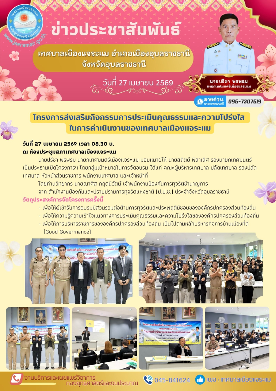 วันอังคาร, 28 เมษายน 2569 10:45วันที่ 27 เมษายน 2569 เวลา 08.30 น. -นายปรีชา พรพรม นายกเทศมนตรีเมืองแจระแม มอบหมายให้ นายสถิตย์ พิลาเลิศ รองนายกเทศมนตรี เป็นประธานเปิดโครงการส่งเสริมกิจกรรมการประเมินคุณธรรมและความโปร่งใส ในการดำเนินงานของเทศบาลเมืองแจระแม โดยกลุ่มเป้าหมายในการจัดอบรม ได้แก่ คณะผู้บริหารเทศบาล ปลัดเทศบาล รองปลัดเทศบาล หัวหน้าส่วนราชการ พนักงานเทศบาล และเจ้าหน้าที่ โดยท่านวิทยากร .. นายณาศิส กฤตนิวัตน์ เจ้าพนักงานป้องกันการทุจริตชำนาญการ จาก สำนักงานป้องกันและปราบปรามการทุจริตแห่งชาติ (ป.ป.ช.) ประจำจังหวัดอุบลราชธานี